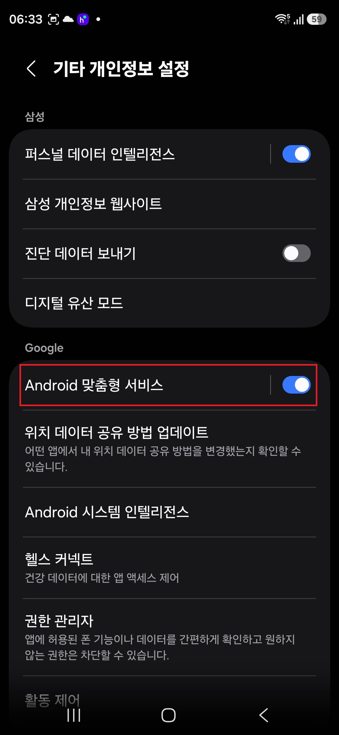 4. Android 맞춤형 서비스 항목은 기본 세팅으로 설정이 되어 있는 상태이다.